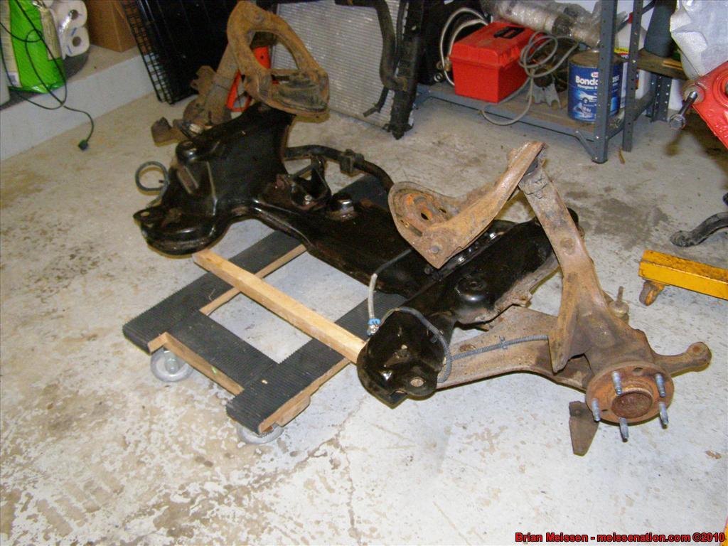 Monday-Friday - Get the shocks, springs, and motor mounts all put onto the v8 kframe. Drop the v6 kframe and get the steering components put onto the v8 kframe. Mount the LT1 onto the kframe. Roll the kframe and the LT1 under Red Alert to just store it while we're not working on it. Get v6 kframe out of the garage. This will then allow my mom to go back into the garage - which is a political move.