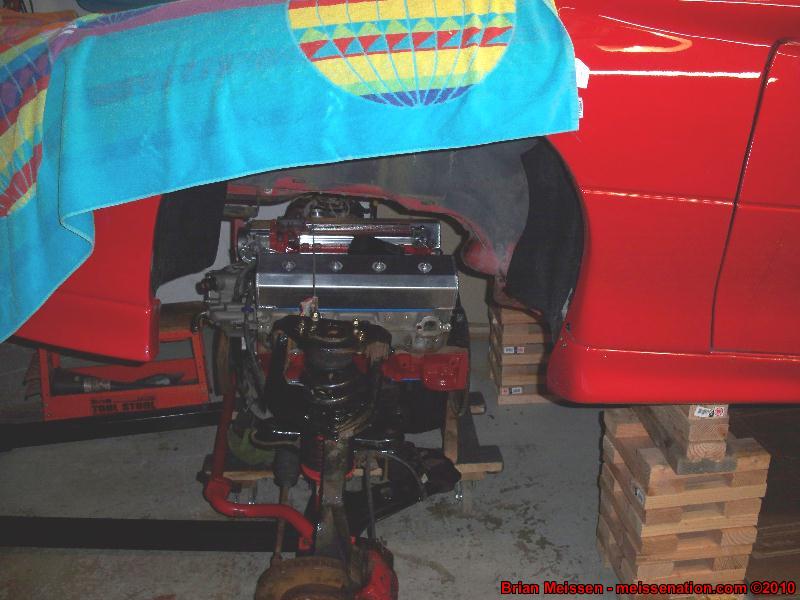 We have the k-frame/LT1 assembly sitting on top of a furniture moving dolly that we had from awhile ago. If memory serves correctly, someone told me that you can get a similar dolly from Harbor Freight. I've never been to Harbor Freight so I don't know the specifics. The height, including the k-frame assembly, is roughly 33 inches. The car's current height is more like 36-40 inches because there is a portion of the metal wheel well that comes down further than the fender lining. In this picture you can see the red metal that comes down further than the black of the fender wheel well lining. We originally thought we only had to measure to the height of the top of the wheel well but then that red bump got in the way so we had to raise the car higher than that red bulge.