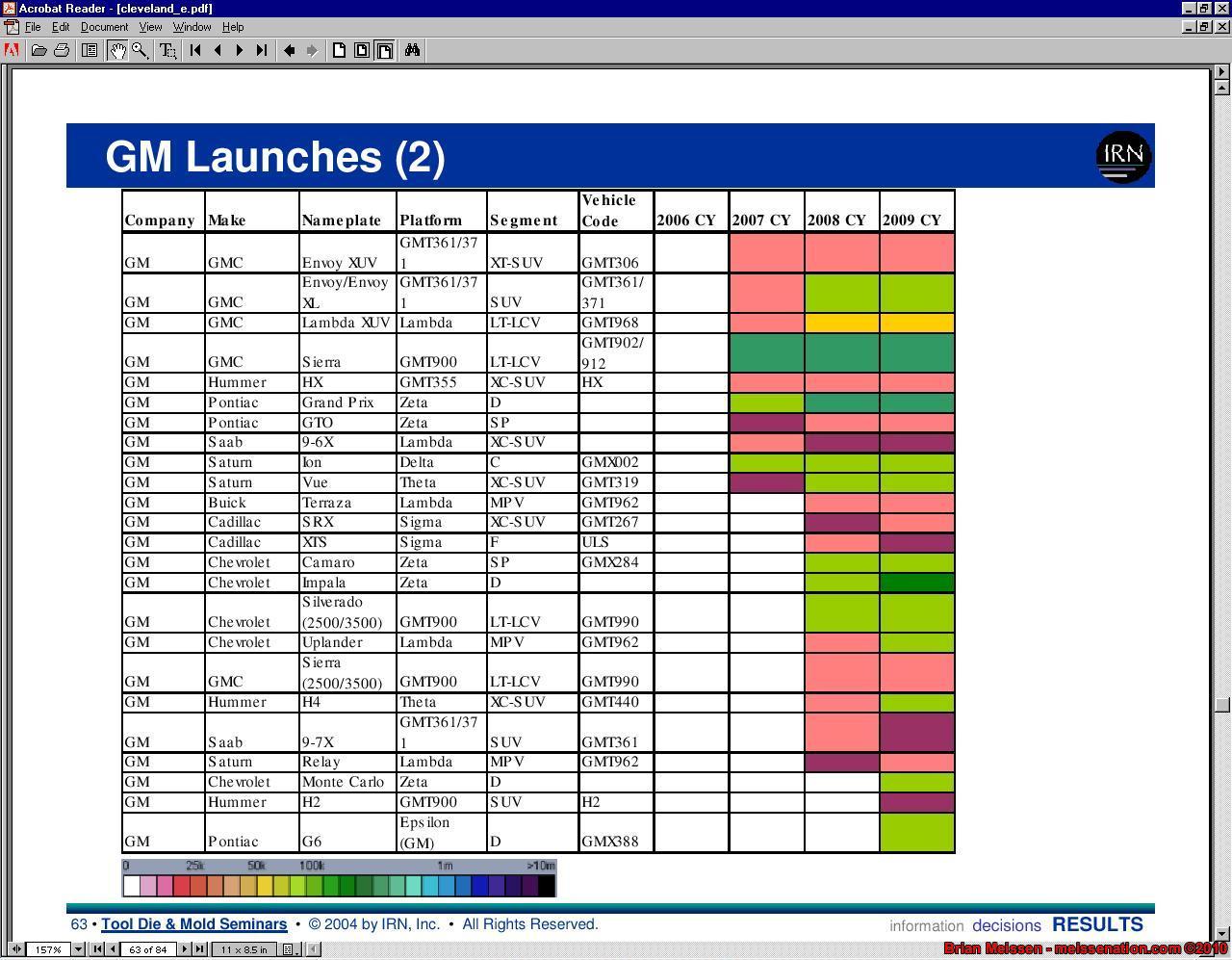Early 2005: A Canadian export PDF file - Cleveland_E.pdf - set the rumor mills on fire. It was some sort of presentation but it had tables of planned exports. Page 11 was the gold mine for Camaro enthusiasts - amongst other GM vehicles, one line stood out: Camaro, Zeta, 100,000. Model, platform, estimated products. I think it also had year - 2008 if I remember correctly, but I'm fuzzy on that part. I actually had saved it and had it hosted on meissenation.com ( Image here: http://meissenation.com/pictures/uno...nfirmation.jpg ) since then, but apparently in the most recent server move the file was corrupted.